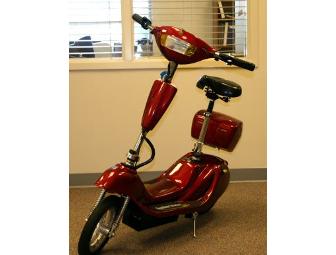 Have tons of fun on this electric, rechargeable maroon sunshine scooter.