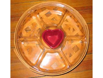 This Henn Workshops appetizer basket with sectioned plastic liner and lid is perfect for your next get-together. Includes "Heart Ramekin" pottery in "Garnet Jewel". All handmade in America.