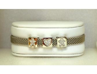 This is an amazing 18 carat white gold mesh bracelet, with 3 individual charms; a diamond boy, a heart and a diamond girl.
