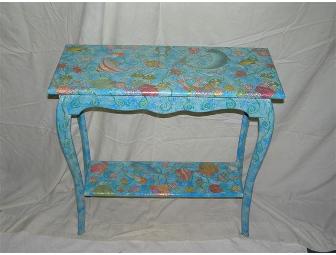 This table is a bright and whimsical representation of what lies beneath the ocean's surface. The combination of paint, decoupage and gold relief gives the piece greater dimension and enhances both the importance of color and texture in Artist Eileen Kneeland's work. The three coats of protective polyurethane applied to the table will help to protect and increase the life of the this beautiful and unique piece of art for the home.