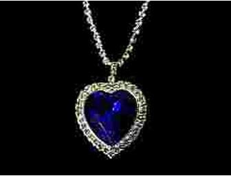 Exact replica of astonishing heart-shaped pendant necklace worn by Rose De Witt Bukater (as portrayed by Kate Winslet), and lost at sea, in the movie 'Titanic.' Length: 18 inches, comprised of 84 faux diamonds. The large heart-shaped blue faux 75k diamond solitaire, encricled by a single row of faux daimonds.