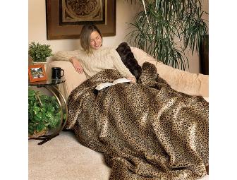 Relax in the lightweight warmth of this Fabulous Fur throw. Meant to be USED, both the soft dosuede lining and Leopard faux fur front are machine washable. Item measures pproximately 59" x 54". Made in USA.