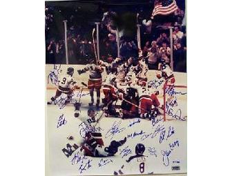 This is a team signed color 16x20 photograph of the 1980 USA hockey team's historic victory of Russia in the 1980 Lake Placid Olympics. This photograph is signed by all 20 players including Mike Eruzione and Jim Craig. It is professionally matted and fra