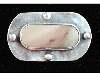Leigh Davenport, registered Roycroft Renaissance Artisan, has created a stunning hand-hammered sterling silver pin set with Imperial jasper. Measures 1" x 1.5". This piece would be a lovely addition to any outfit.