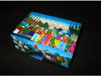This beautiful little box is hand painted by native Ecuadorians. There are two scenes painted: one with farmers, mountains, a river and sheep; the other, a festival in the mountains. The three other sides are decorated with designs. Inside is not padded, but is painted green and blue.