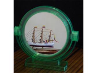 This green mirror is double sided. The frame is made of plastic. One side is normal and the other is a mystery! It is curved, displaying everything upside-down and topsy turvy! Good quality and great color!!