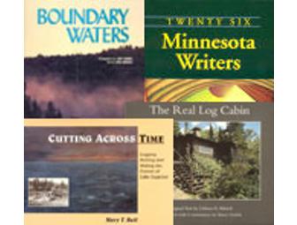 BOOKS, BOOKS, AND MORE BOOKS! Here's what you get: 1). Boundary Waters Photographs by Jerry Stebbins and text by Greg Brening. ISBN 0-931714-48-6 A beautiful rendering in words and pictures of a precious natural and recreational resource. 2). 26 Minnesota Writers Edited by Emilio and Monica de Grazia ISBN 0-931714-91-5 Short-stories, reminiscences, personal reflections--this collection offers a variety of forms and persectives on themes ranging from childhood memories to rural life and travel. Much of it is personal, some carries a regional stamp, but the voices are invariably fresh, and the vision clear-sighted and original. 3). Cutting Across Time ISBN 0-931714-84-2 This entertaining book recounts one chapter in the history of logging the forests of the North Shore of Lake Superior, and then rafting the timber across the lake to mills in Wisconsin. 4). The Real Log Cabin ISBN 0-931714-51-6 This fascinating book offers parallel texts, one from 1928, the other from 1994, examining all aspects of building and maintaining a log cabin. Fireplaces, gables, porches, windows--every detail, both inside and out, will appeal to those interested in building a log cabin, and those who simply want to soak up the ambiance of a simpler and more rugged time.