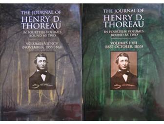 Winner will receive a set of the hardbound Dover Edition of The Journals of Henry D. Thoreau in Fourteen Volumes Bound as Two. These editions are unabridged republications of the 1906 edition, and total 1888 pp. Book One includes Volumes I-VII (1837-October, 1855. Book Two includes Volumes VIII-XIV (November, 1855 - 1861). They are edited by Bradford Torrey and Francis H. Allen, and include a foreword by the late Walter Harding, then Secretary of the Thoreau Society. The Books measure 8 3/4 inches x 12 1/2 inches.