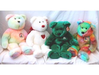 We're all in this together! On the left we have "Pastel Peace" bear, then "Valentino" bear with his heart emblem, then "Erin" bear with a shamrock badge, and finally "Peace" bear. Build your collection today or make some lucky children giggle!