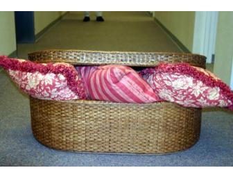 Fabulous Raw Wicker Coffee Table from the wonderful Nantucket Trading Emporium. This coffee table is 43 inches wide and 28 inches deep. It opens for additional storage and would add delightful charm to any room in your house. As an added bonus, the table is filled with 2 spectacular burgundy chince down pillows. Seaside elegance!