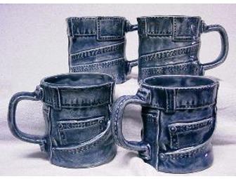 4 "denim" mugs with jean details. Handmade and painted by the students in our South Area Adult Growth Experience program.