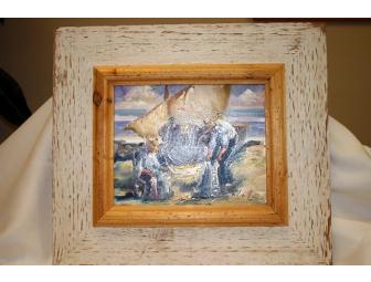 This lovely 15 x 17 painting is by self taught artist Delmonte. It is framed in a rustic off white wood. His work has been in exhibition all round the world and is shown at Tusk on Azalea Lane.