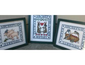 Set of 3 framed counted cross stitches, 'Pigs,' 'Chickadees' and 'Rabbits' by Sharon Hsu