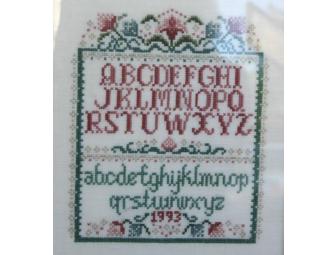 Framed sampler counted cross stitch by Sharon Hsu, 9"x10"