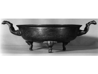 Early 20th century tourist copy of incense burner used in Buddhist or Shinto rituals, acquired in China. Bronze, handles attached with iron rivets, legs part of casting. Good condition. Censer measures 10" in diameter and 5" high.