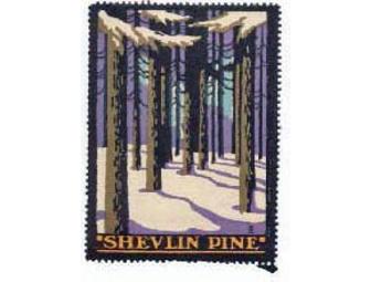 Two inch by two and three quarter inch single stamp. Art deco style pine forest in winter illustration.