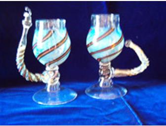 Set of hand-blown glass drinking vessels with decorative handles and black and orange stripes on body. Approximately 5 1/2 inches tall. Made by Gazelle Glass Studio, Philomath, Oregon