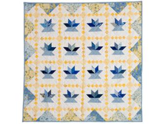Using the basket quilt pattern as inspiration, the artist gives this quilt a cheery, contemporary feel by using yellow and blue printed fabrics. The pattern was designed by quilt celebrity, Alex Anderson, and was featured recently on the cover of Quiltmaker magazine. Dimensions: 43" square