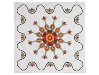 This quilt is a reproduction based on one of the blocks in the Pomegranate Quilt. This is an unusual design, not generally known in the quilt world. Detailed attention to color, design, appliqué and hand quilting techniques make this quilt an incredible find. Dimensions: 42" square.