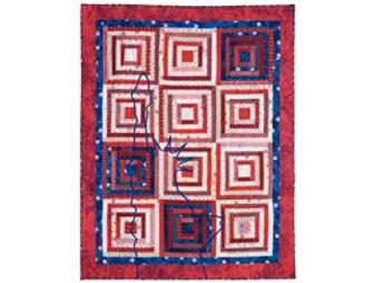 Inspired by the classic color scheme of red, white, and blue, the artist has created a quilt using the log cabin block variation "Courthouse Steps." The "Miss Liberty" silhouette of couched ribbon adds even more punch to this dynamic, patriotic wall hanging. Dimensions: 36" x 46"