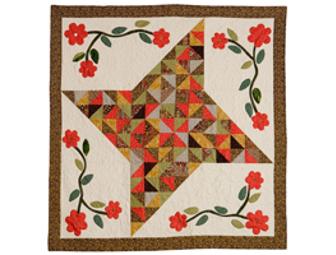 Inspired by the Whig Rose Quilt, the artist chose fabrics of coral, green, and brown with an antique feel in pattern and color. Another feature that is often found in historic quilts, but less so in contemporary ones, is the use of appliqué and pieced designs in the same quilt. Corner motifs of flowers and vines set off the striking, central "Friendship Star" pattern. Dimensions: 49" square.