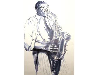 Local artist Peter Gutterman has provided WPFW with the essence of the "Yard Bird" Charlie Parker in this black and white print. Rick Bolling host of Thursday's Evening Jazz is the item donor for this 12 1/2 x 16 print.