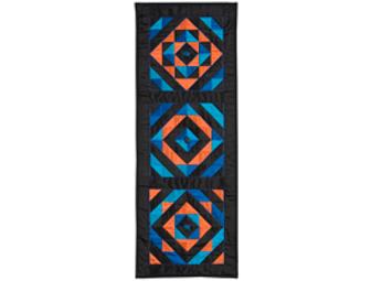 Duppioni silk is used to create this stunning banner in saturated colors of royal blue, turquoise, and black. Half square triangles of contrasting colors compose three different diamond designs, inspired by the quilt "Broken Dishes." Pima cotton is used for the backing fabric and binding. Quilt has metallic thread and button embellishment. Dimensions: 44.5" x 16.5"