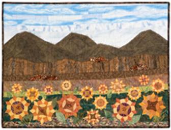 The artist was intrigued and inspired by the complexity of the "Caesar's Crown" block. Fresh images of fields of sunflowers and the majestic Rocky Mountains from a recent trip to Colorado led her to interpret this block in landscape form. Quilt has fused appliqué, bead embellishment, and is machine quilted. Dimensions: "26.5 x 35"
