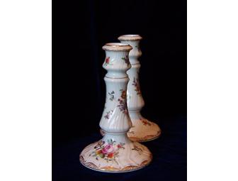 White Royal Danish porcelain candlesticks with floral design and gold trim. Each is 6 3/4" high. Beautiful antiques in perfect condition