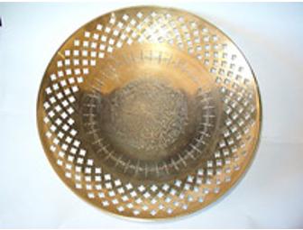 Made in India. Brass plate with incised floral decoration and pierced edge. About 10" in diameter.