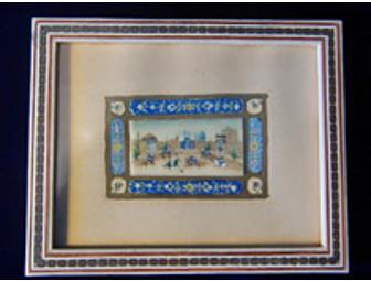 Framed Persian miniature picturing polo players in courtyard. Image measures 2" x 3 1/4".