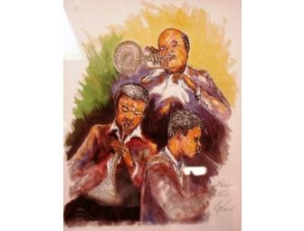 This print of a "Brass Trio" by former Washington running-back and accomplished artist George Nock is autographed. With the vividness of this trio, you can almost hear the music.