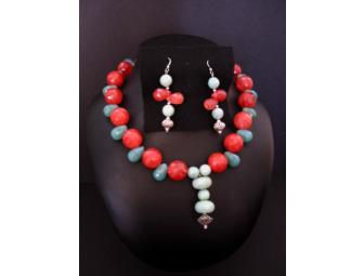 Light dances off the facets of this perfectly matched necklace and earrings set by artist Vernita Henderson. The "chunky" bead necklace measures approximately 18" in length and is secured by an ornamental silver toggle clasp, flanked by small, silver beads. The french hook earrings measure approximately 3" in length and are also secured at the bottom with ornamental silver beads.