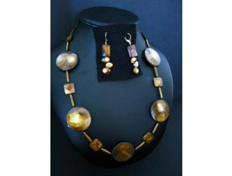 Featuring three different shapes of beads, this lovely Mother-of-Pearl necklace and earrings set by artist Vernita Henderson is both subtle and distinctive. The "chunky" bead necklace measures approximately 25" in length and is secured by an ornamental gold toggle clasp. The pierced earrings measure approximately 2.5" in length and are also secured at the bottom with small freshwater pearls.
