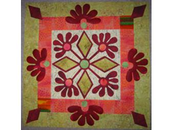Based on the Mexican Rose pattern, "Me Rosita" is a lively wall hanging in limes and peaches. Techniques include fusible web applique, free motion quilting, and bead embellishment. Dimensions 30" x 30".