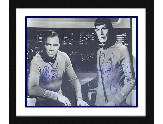 This item is a vintage 11x14 photograph from the original Star Trek television show hand signed by Capt. Kirk (William Shatner) & Dr. Spock (Leonard Nimoy). It is professionally matted and framed in a black wood frame.