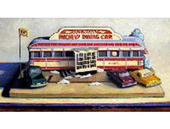 Rhode Island artist Peter Campbell transports us "back to the future" to celebrate the rich history of an American icon in Mickey's Diner Car. This lush and lovingly rendered still-life depicts a cast iron model of a well known diner. "The idea for this painting came out of my love for American Diners and the way they are set into the urban landscape," Peter notes.