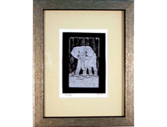 "The dance -- the elephant-dance! I have seen it..." Little Toomai exclaims in Rudyard Kipling's The Jungle Book. And no doubt Johann LeRoux has seen it, too. Johann's love of the fauna and flora of his native South Africa is evident in this silver on black signed limited edition linoleum cut (60/100). In a gold wood frame under glass, the piece measures 13"(h) x 10"(w) (image size: 6" x 4").