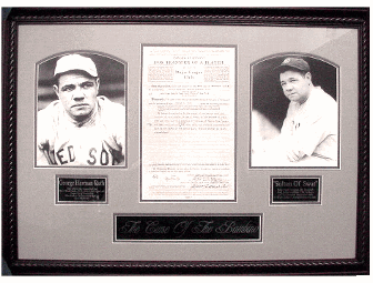 One of the most famous moments in baseball history. On December 26, 1919, the Boston American League Baseball Team sold the rights to Babe Ruth to the American League Baseball Club of New York (NY Yankees) for $100,000. We all know the rest of the story as the Yankee went on to win numerous championships and the Red Sox only have won one. This awesome piece is beautifully framed in a vintage museum quality frame with double matte and nameplates. Pictured here is a photograph of Ruth on both teams and a copy of the actual contract describing the details of the agreement. This piece measures 23x33.