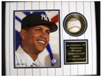 'This is a hand signed baseball of Alex Rodriguez in a shadowbox framed with Yankee Pinstripe matting, a nameplate and a photo from the press conference introducing Alex Rodriguez as the newest member of the Yankees. Limited Edition.'