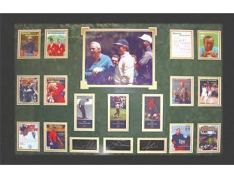 Bids are for a masterpiece collage that features Tiger Woods, Jack Nicklaus, and Arnold Palmer. History always happens at the Masters, one of golf's four majors. Just once though, in Augusta, GA, did three of golf's greatest players, Tiger Woods, Jack Nicklaus, and Arnold Palmer, play a round together. For one great moment, time stood as all three posed at a tee box. This framed 24x36" piece features an 8x10 photo of the three legends, surrounded by golf cards and other images, and is capped off with laser-engraved replica signatures from each champion.