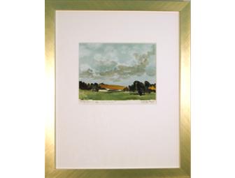Judith Bertozzi's atmospheric watercolor creates a quiet, restful mood as viewer and artist alike become immersed in Looking Across the Westport River. In a gold wood frame under glass, the watercolor measures 22"(h) x 18"(w) (image size: 8" x 10").