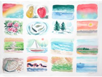 An eye-catching and colorful collection of 16 miniature landscapes, Hiroko Shikashio's work celebrates sea and shore in its changing moods and seasons. Whether you're a New England "lifer" or lover, you'll enjoy owning New England Landscape #30. The signed limited edition (3/400) giclee print measures 24"(h) x 30"(w) in a silver metal frame.