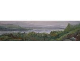 Bella Vista, Lake Winnipesaukee, is Kristi Johnston's panoramic paean to the splendor of a New Hampshire landscape. Her watercolor captures the soft tones of New Hampshire's largest lake, wrapped in a sweeping expanse of trees and beautiful rolling mountains. Archivally framed with an off-white mat, the artist chose a stained wood frame to complement the painting's earth tones. It measures 10"(h) x 22"(w) (image size: 4" x 16").