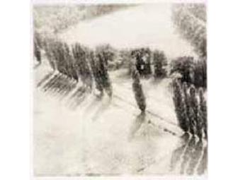Landscape and sky become one in this soft-focused, timeless etching by Diana Jacobs titled View #21. Based on aerial views taken from a hot air balloon in France, this breathtaking hand-colored etching is part of the artist's Topologie Series. It is signed and numbered (5/6) measuring 23"(h) x 20"(w) in a metal frame under glass(image size: 8" x 8").