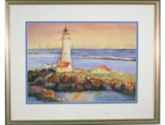 With Boston's city skyline sketched faintly in the background, Boston Harbor Light stands majestically on its rock-solid island, flanked by little 'village' homes. Painted at sunrise and surrounded by the frosty blue waters of the harbor, Sylvia Lauro's romantic and colorful watercolor measures 17" (h) x 21"(w) in a gold wood frame under glass.