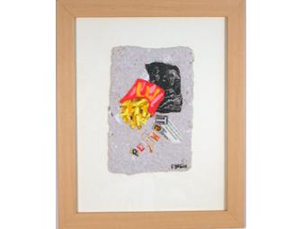 From a series called Table Blessings, Tilly Strauss' collage reminds us that what we eat is political as well as personal. Using paper made from corporate packaging, the artist juxtaposes text from agriscience and the image of McDonald's fries against the dark backdrop of Van Gogh's Potato Eaters. "A vocal proponent of local organic foods", Strauss has, "nevertheless, been 'tempted' by commercial fast food."