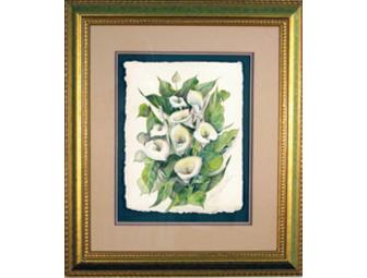 California artist Susan Strong Muir combines the sophisticated elegance of calla lilies with dynamic compositional rhythm in her lively raw-edged watercolor. Our photograph cannot do justice to the exquisite framing of the piece, as it is set in relief and then double matted, with a lovely gold leaf wood frame. It measures 24"(h) x 20"(w) framed under glass (image size: 12" x 9").