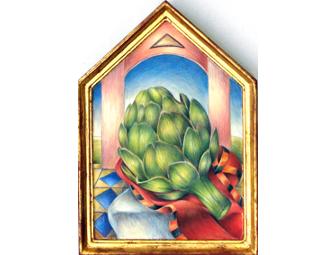 Rest House: Slumbering Artichoke is an egg tempera painting measuring 11"(h) x 8"(w) in a gold wood frame.