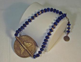 Artist Renee Moore Brooks uses beads as symbols to tell a story. In Lapis Butterfly, Renee uses an African brass butterfly medallion as the centerpiece. It is set off by deep lapis blue beads, which "help one to speak their truth". It is finished with a small brass spiral, symbolizing "the soul seeking eternal truth". This is a unique and eye catching neckpiece, hand crafted by the artist. It measures 18".